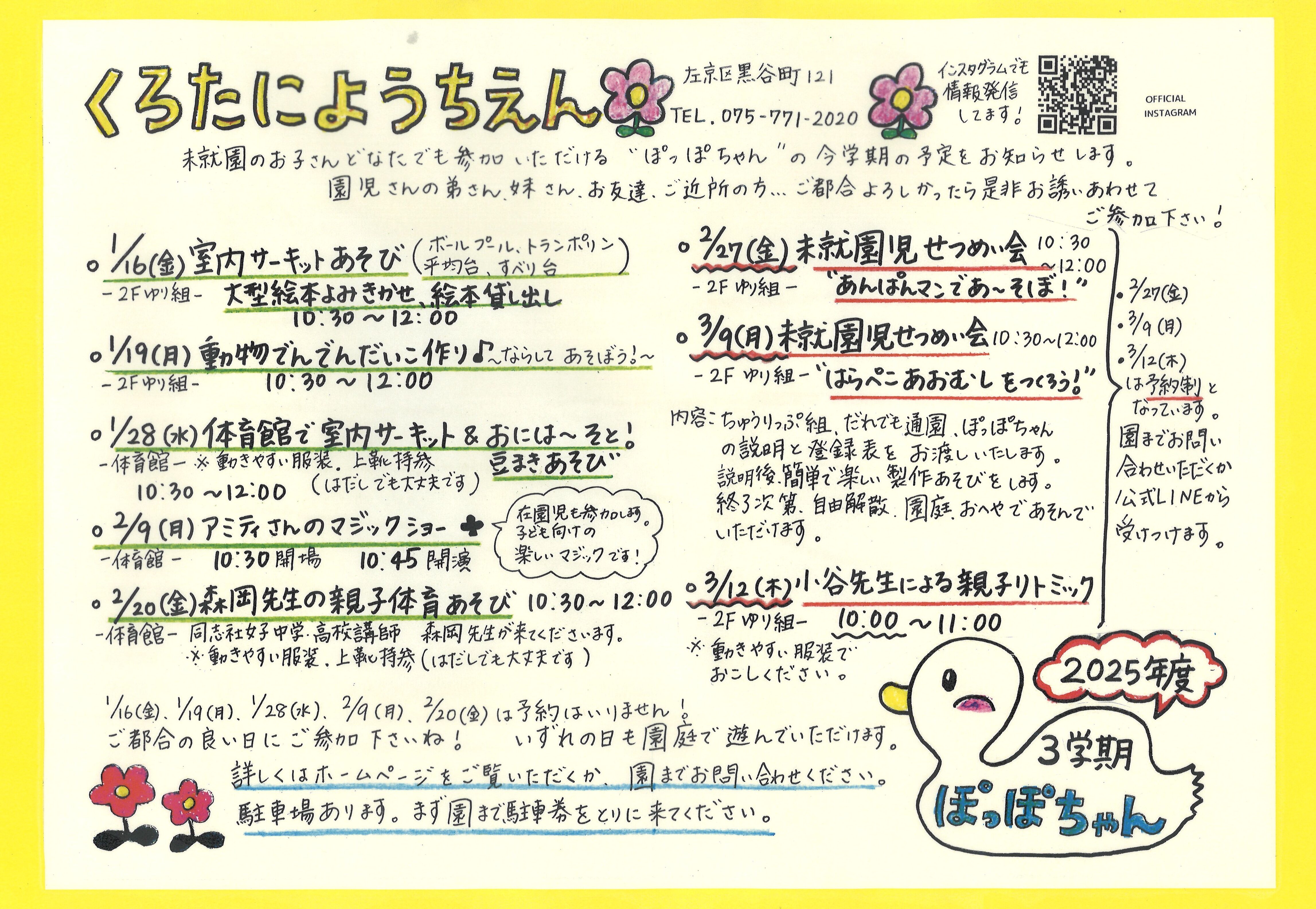 くろたに幼稚園は、創立から変わらず「子どもが真ん中」という想いを大切にしてきました。子どもたちが安心してのびのびと過ごせる環境の中で、「明るく、正しく、仲良く」という理念のもと、心豊かでたくましく、そして優しさを持った子どもに育ってほしいと願っています。